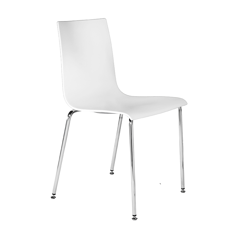 Sedia impilabile composta da scocca interamente realizzata in HIREK ® con finitura lucida e da telaio a quattro gambe tubolare Ø 16/18 mm in metallo cromato o verniciato.