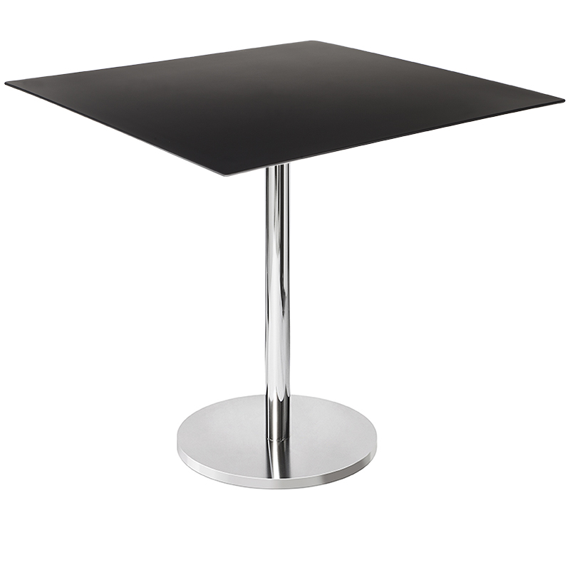 Tavolo composto da piano interamente realizzato in HIREK ® con finitura fotoincisa e da telaio cromato con base metallica tonda.